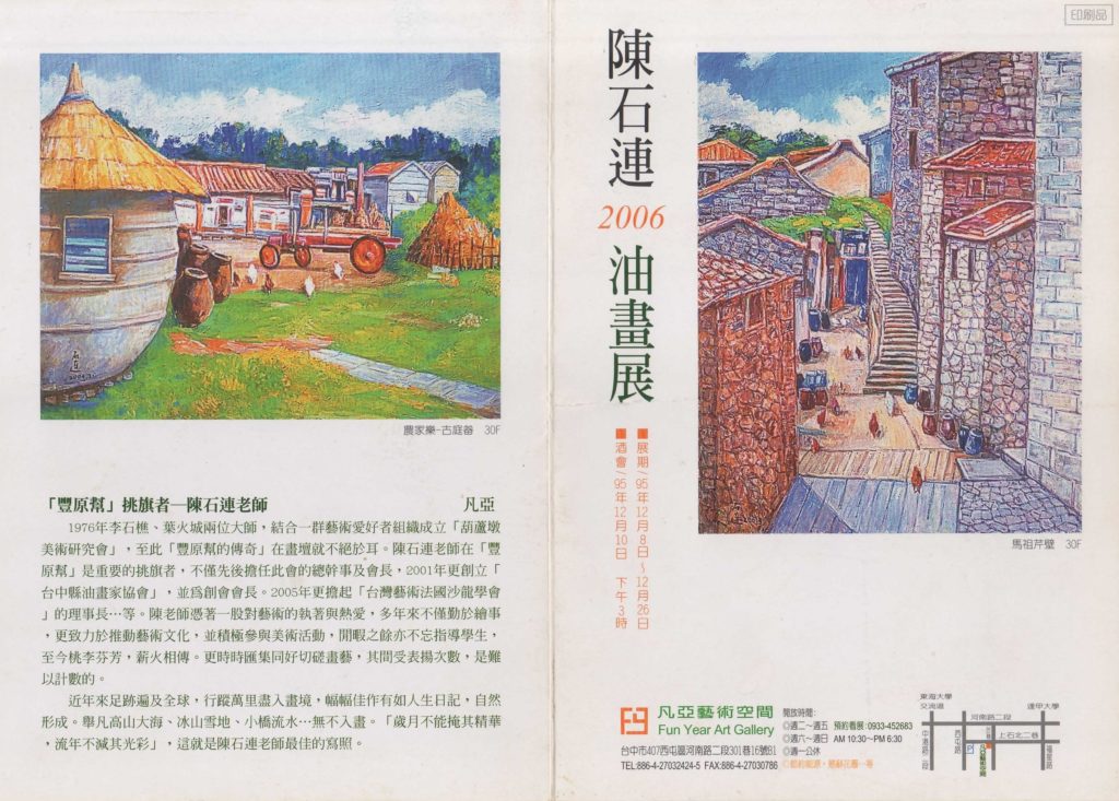 1976年李石樵、葉火城兩位大師,結合一群藝術愛好者組成立「葫蘆墩美術研究會」,至此「豐原幫傳奇」在畫壇就不絕於耳。陳石連老師在「豐原幫」是重要的挑旗者,不僅先後擔任此會的總幹事及會長,2001年更創立「台中縣油畫家協會」,並為創會會長。2005年更擔起「台灣藝術法國沙龍學會」的理事長…等。陳老師憑著一股對藝術的執著與熱愛,多年來不僅勤於繪事,更致力於推動藝術文化,並積極參與美術活動,閒暇之餘亦不忘指導學生,至今桃李芬芳,薪火相傳。更時時匯集同好切磋畫藝,期間受表揚次數,是難以計數的。